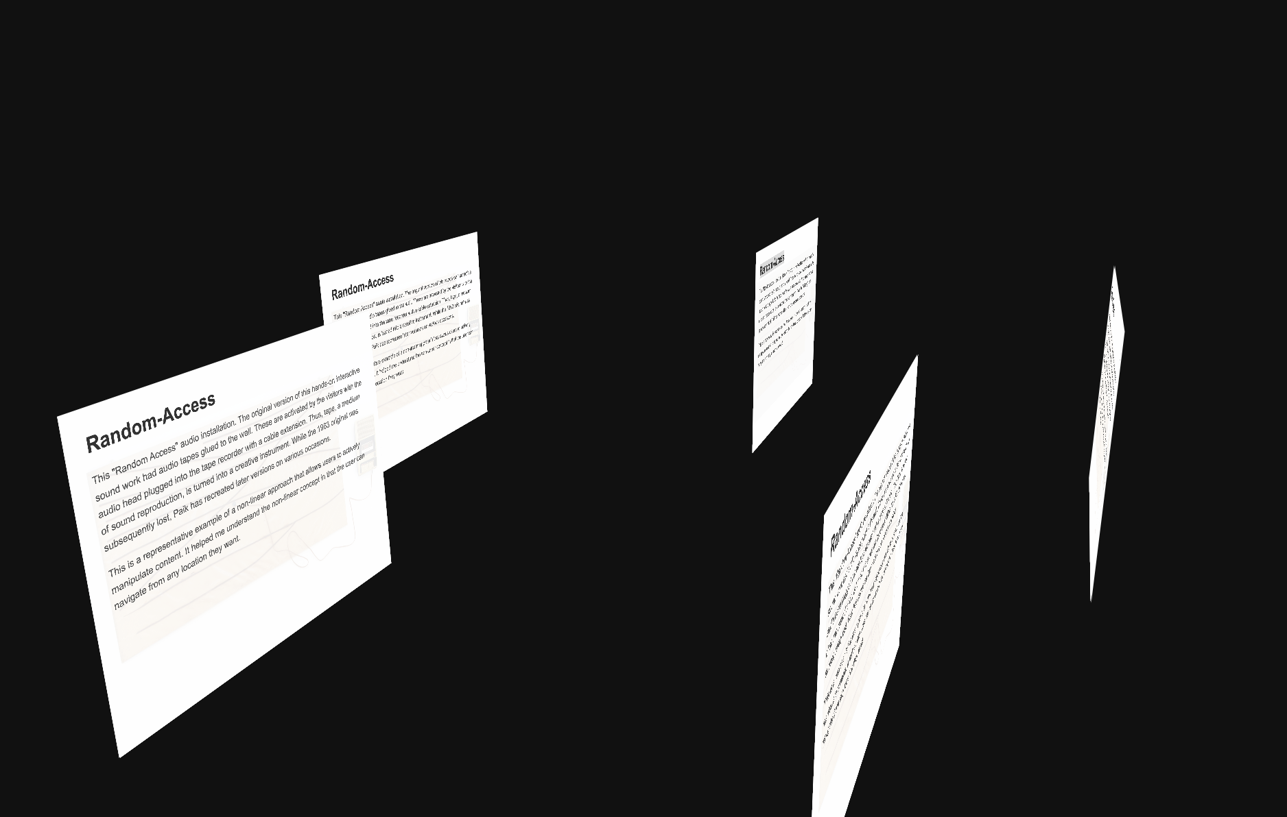 So, I tried to express the structure that enables nonlineal access while maintaining the connection between information in 3D space. Photographs of various works and structures that I used as reference were placed in the ifframe content and placed in the space.