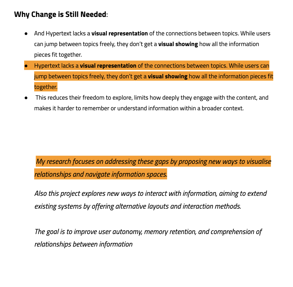 I was also asked why I should change the layout when the current website is functional enough. To answer this question, I thought about the topic with some research, such as Wikipedia and Google, which are functional and efficient, but they make it hard for users to expand connections between a linear way. And also Hypertext lacks a visual presentation of the connections between topics. I thought My further research should focuses on addressing these gaps by proposing new ways to visualise relationships and navigate information spaces.
