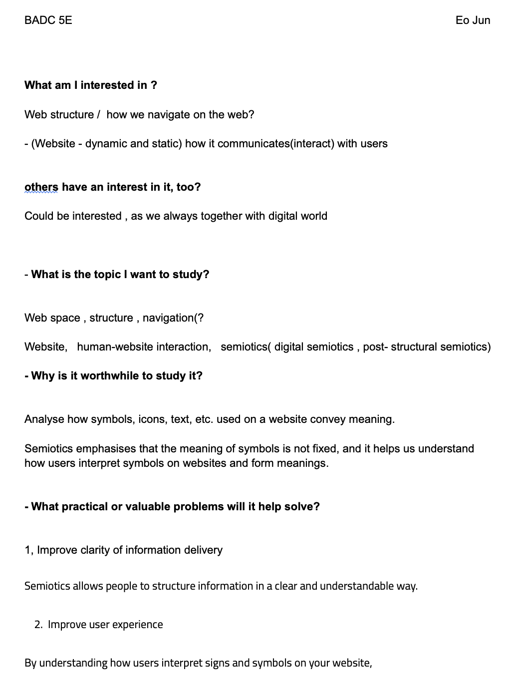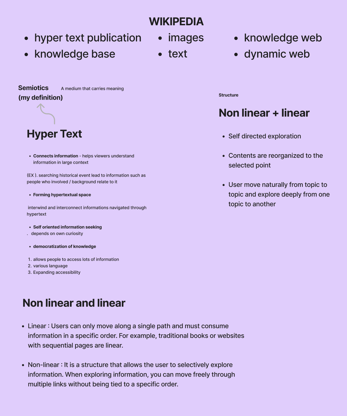 The most voted ones in the mind map were universality and hypertext space, but I wasn't really interested in universality, but nonlinearity and hypertextual were still within my interests. When I was talking about what I gained and what insights I gained through this activity, I realized that my topic wasn't well organized. I still seemed to be interested in how to create the final result rather than thinking about the research approach, and I also had questions about my research flow. In addition, I focused only on the order in which the web grew and specified the result as a webpage, but I realized that the way to classify it was wrong. After receiving feedback that it was too much, I decided to investigate the structure of wekipedia, semiotics, hypertext, etc. by Tuesday, W5.