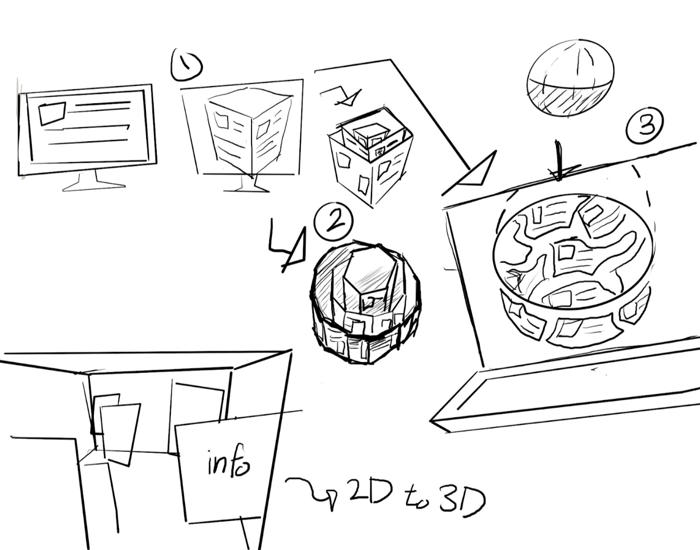 I'm trying to explore different shapes and formats in a three-dimensional space, so I sketched out some initial concepts. To be honest, experimenting with shapes other than the cube for embedding web pages hasn't led to much conceptual development, and I feel like my ideas are currently stuck. To break through this, I started sketching out my thoughts. This led to ideas like layering cubes, breaking web pages into pieces and fitting them into spherical spaces, and the visual concepts labeled as "2D to 3D" in the bottom left corner of my sketches. As I continued to brainstorm, I thought, "What if I unfold this space?" Similar to origami diagrams, I imagined unfolding the space and also creating its fully folded form. I felt that this process could deepen my understanding of the space and help me determine the direction for my project.