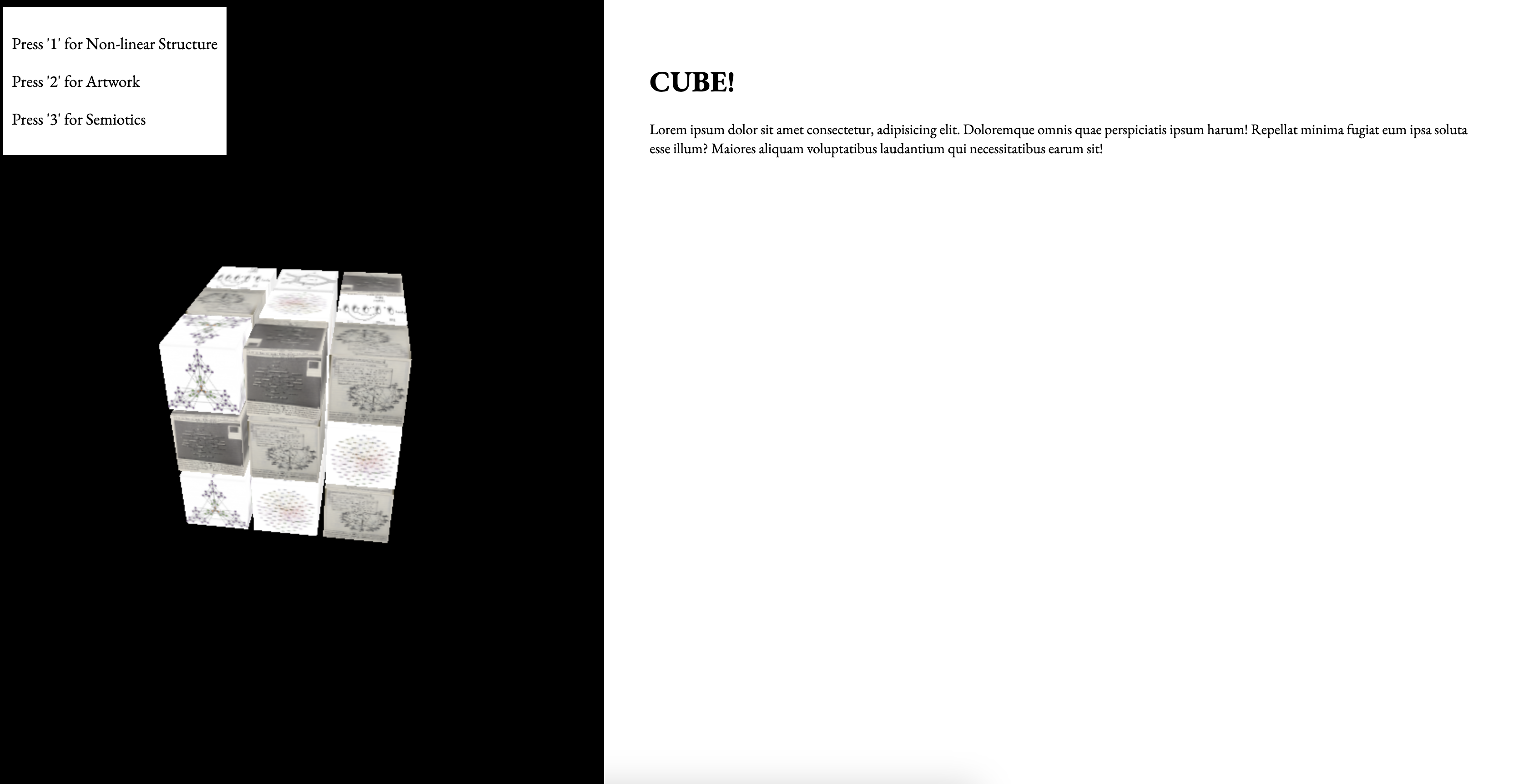 In terms of the web design project, I received feedback and developed it a bit while thinking about some improvements. I think the main thing I thought about was the UI/UX part. As a creator, I was able to fully understand and operate this website, but I thought there might be some confusing things for users, and since I used an iframe to load content in the cube placed in the center, the incongruity when operating other spaces and the iframe part could also be uncomfortable. I tried to solve this by creating a 'button' in the last prototype, but it didn't work as well as I thought. When I thought about this, I thought it was very important to think from the user's perspective. Users who are using the website I am creating for the first time should be able to understand the structure of the website in terms of the interface at once, and they should not feel uncomfortable while operating it, so I felt that there was a lot of room for improvement.